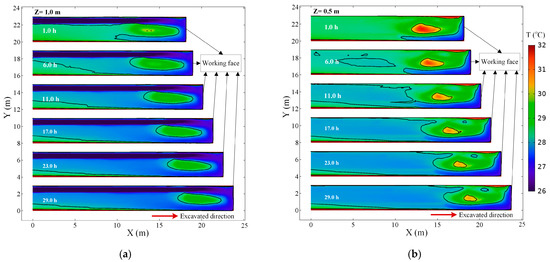 Air temperature distribution in the roadway at different times: (a) air temperature field in the Z = 0.5 m plane; (b) air temperature field in the Z = 1 m plane.