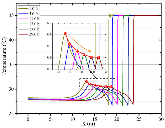 With the increase of ventilation time, the surrounding rock is continuously cooled, and the heat exchange between the airflow and the wall of the roadway decreased, so the air temperature in the roadway decreased. As the ventilation progresses, the heat transfer between the rock and airflow achieved a thermal equilibrium, and the temperature field in the roadway tends to stabilize. Figure 5 presents the air temperature in the central axis of the roadway (Z = 0.5 m) at different times. The peak of air temperature does not exist near the working face. On the contrary, the temperature near the working face is low, and the air temperature within 1 m from the working face is between 27.8–28.2 °C. The air temperature in the roadway rises first and then decreases with the increase of distance from the working face. The air temperature peak existed 5 m away from the working face. After 1 h of ventilation, the air temperature peak on the curve is 31.6 °C, and 3.3 °C higher than the air temperature at the exit of the roadway. The air temperature peak gradually decreased with the ventilation time, and finally stabilized at about 30.5 °C. The air temperature at the exit of the roadway decreased from 28.2 °C in the 1 h to 27.7 °C in the 29 h.