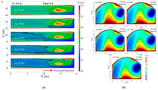 Air temperature distribution in roadway under different ventilation velocity: (a) air temperature in the Z = 0.5 m plane; (b) air temperature in the Y = 15 m section.