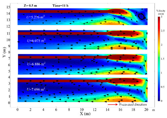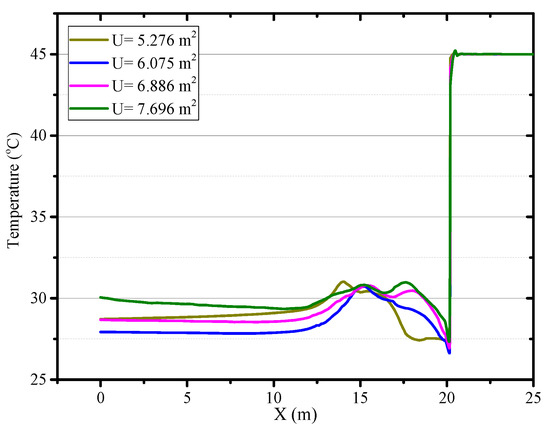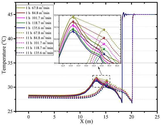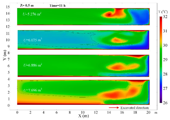 At a constant ventilation volume, the variation of the size of the roadway section will affect the movement of airflow in the roadway. The thermal performance in the roadway under different roadway section sizes of U = 5.276, U = 6.075, U = 6.886 and U = 7.696 m2 are investigated. When the roadway section size is 5.276 m2, the airflow field has an obvious change in the roadway and there are two cycle flow areas in the Z section as shown in Figure 16. The airflow jetted from the air duct does not flow directly along the wall to the working face, but first moves to the other side of the roadway and then flows to the working face. In that scenario, in the range of 0~3 m from the working face, the air temperature decreases obviously, but the air temperature rises elsewhere, which can be seen in Figure 17. When the roadway section size is large, the airflow directly flows to the working face and then back to the exit of the roadway, the low temperature zone is very close to the working face and road wall. This implies that it is essential to control the movement of airflow, and the airflow should first cool down where people and machines are, which can promote the utilization of cool energy. As the roadway section size increases, the surface area of the surrounding rock of roadway increases, and the air temperature increases due to the increase in the heat release from the surrounding rock. The main region of temperature rise is in the Backflow zone of the right wall and Vortex zone. When the section area of roadway increases from 6.075 to 7.696 m, the air temperature at the exit of roadway rises from 27.9 to 30.1 °C, as shown in Figure 18. Thus, once the roadway section size increases during the construction of roadway, the cooling approaches should be strengthened correspondingly.