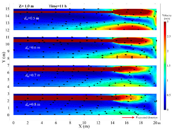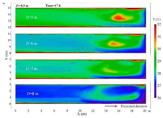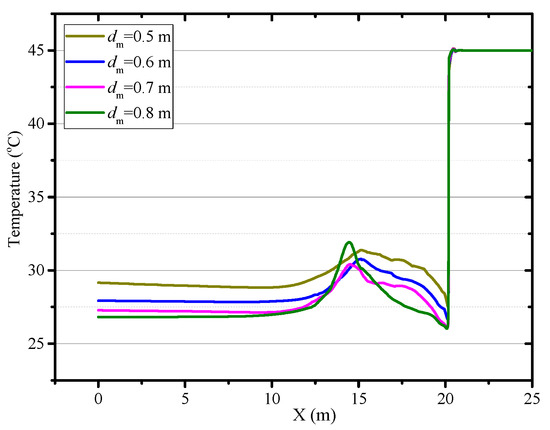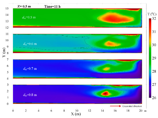 The diameter of the air duct directly affects the released airflow velocity, so it is a critical factor to the thermal performance in the roadway. In this section, the airflow and thermal performance in the roadway with a constant ventilation volume of Q = 102 m3/min and diameter of air duct sizes of dm = 0.5, dm = 0.6, dm = 0.7 and dm = 0.8 m are investigated. Figure 8 shows that when the diameter of the air duct decreases, the airflow velocity increases in the roadway especially near the roadway wall and the working face, which increases the convective heat transfer between the surrounding rock and airflow. Therefore, the smaller the air duct, the higher the air temperature in the roadway and the larger the area of the local high-temperature zone, as shown in Figure 9. When the diameters of the air duct are 0.5, 0.6, 0.7 and 0.8 m respectively, the air temperatures in the exit of the roadway are 29.16 °C, 27.93 °C, 27.28 °C, 26.81 °C respectively, the maximum difference in the air temperatures is 2.35 °C. When the diameter of the air duct is 0.8 m, the maximum temperature in the vortex zone is higher than that when the diameter of the air duct is 0.7 m. This is because although the reduction in duct diameter reduces the area of the vortex zone, the low airflow velocity results in a more serious accumulation of heat in the vortex zone. Figure 10 shows that there is an obvious variation in air temperature near the working face as the air duct diameter, which results from the change in airflow velocity. In general, increasing the diameter of the air duct has a benefit to improving the cooling effect in the roadway by weakening convection heat transfer in the working face. However, the selection of air duct diameter is limited by the roadway construction space.