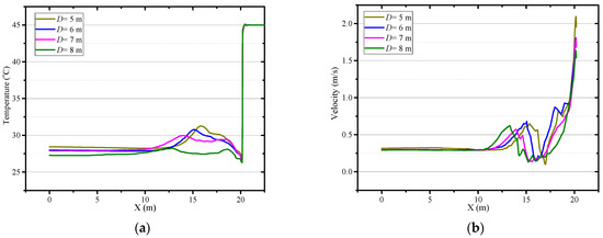 Figure 11 depicts the airflow performance with a constant ventilation volume of Q = 102 m3/min and different distances between the duct outlet and working face. Increasing the distance between the duct outlet and the working face, the center of the vortex zone is further away from the working face. Meanwhile, the area of the local high-temperature zone reduces with the increase of distance between the duct outlet and working face, as shown in Figure 12. So the increase of the distance between the duct outlet and working face can prevent the accumulation of heat in the roadway to some extent. As we can see from Figure 13a, when the distance between the duct outlet and working face is 8 m, there is no obvious peak of air temperature on the center line. In general, the longer the distance between the duct outlet and working face, the lower the air temperature in the roadway. According to Figure 13b, it can be concluded that increasing the distance between the air duct and the working face will reduce the airflow velocity near the working face, so where the convective heat transfer between the surrounding rock and airflow decreases, which results in a reduction of heat release from the working face. Therefore, the cooling effect in the roadway can be appropriately enhanced by increasing the distance between the air duct and the working face. Nonetheless, it should pay attention to the accumulation of toxic and harmful gases near the working face caused by the reduction of airflow near the working face as the increase of the distance between the air duct and the working face.
