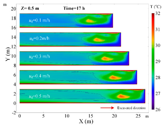 Air temperature distribution in Z = 0.5 m plane under different advance rate of the working face.
