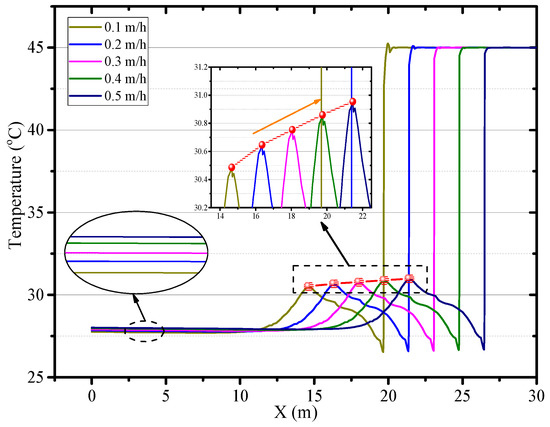 Figure 14 depicts that the air temperature in the Z = 0.5 m plane under a different advance rate of the working face. The adjustment of the advance rate of the working face has no significant effect on the airflow field. At a different advance rate of the working face, the local high-temperature zone maintains the same distance from the working face and the air temperature in the local high-temperature zone is higher. The air temperature in the central axis of roadway increases with the mining speed as shown in Figure 15. As the advance rate of the working face is increased from 0.1 to 0.5 m/s, the peak of air temperature on the central axis of roadway raises from 30.48 to 30.96 °C. The main reason is that the faster the advance rate of the working face is, the higher the temperature of the working face, and more heat release from the working face. Besides, the rapid growth of the length of roadway also increases the heat release from the surrounding rock. Therefore, decreasing the advance rate of the working face can improve the thermal environment for the workers.