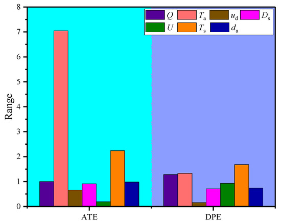 Table 3 shows the sensitivity of factors for each index. The orthogonal test of the ATT presents that the Range of the initial temperature of ventilation airflow is the largest, indicating that the initial temperature of ventilation airflow has the greatest influence on the average air temperature in the roadway. The influence of the surrounding rock temperature is next in line for the average air temperature and the roadway section size is minimal. The factors impacting the average air temperature in the roadway in a descending sequence are as follows, the initial temperature of ventilation airflow > temperature of surrounding rock > ventilation volume > diameter of air duct > distance between duct outlet and working face > advance rate of working face > roadway section size. These factors have different performances on the local heat accumulation in the roadway. The temperature of the surrounding rock has the greatest influence on the DPE, which means that the higher the temperature of surrounding rock is, the easier it is to accumulate heat and form a local high-temperature zone in the roadway. The influence of the advance rate of working face to the local heat accumulation is the least. The sensitive comparison of the factors on the indexes of ATE and DPE is shown in Figure 19.