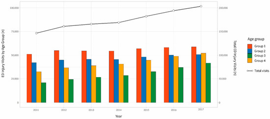 Emergency Department (ED) visits for injury by age group and total ED visits during 2011–2017. Group 1 (18–34 years old). Group 2 (35–49 years old). Group 3 (50–64 years old). Group 4 (65 years and over).