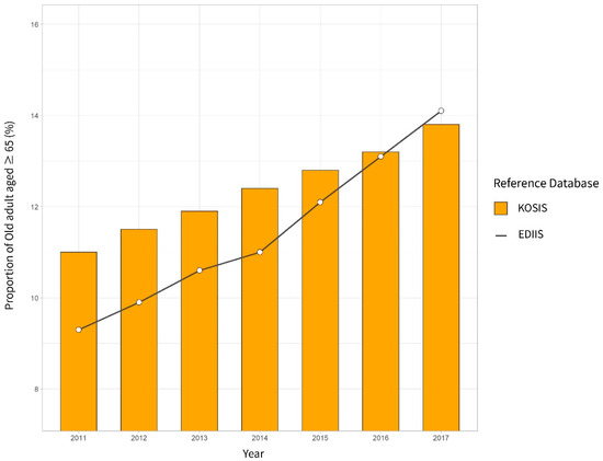 Proportion of older adults aged ≥65 years computed using the Emergency Department Based Injury In-Depth Surveillance (EDIIS) for patients with injury and the Korean Statistical Information Service (KOSIS) for the total population.