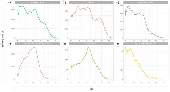 Six of the most common places of injury by age. (a) Number of injuries in the transport area (including roads) by age; (b) number of injuries at home by age; (c) number of injuries in commercial area by age; (d) number of injuries in industrial or construction facilities by age; (e) number of injuries occurring countryside (including sea and river) by age; (f) number of injuries in sport and athletics area by age. ED: Emergency department.