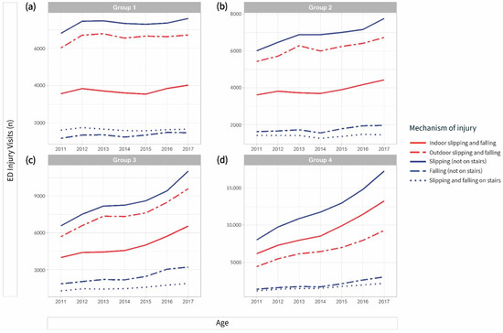 Subgroup analysis of slipping and falling in the injury mechanism by age group. (a) Group 1 (18–34 years old), (b) Group 2 (35–49 years old), (c) Group 3 (50–64 years old), (d) Group 4 (≥65 years). The red line indicates a subgroup that was divided into indoor and outdoor. The blue line indicates another subgroup divided into slipping and falling, which did not occur on stairs or occurred on stairs.