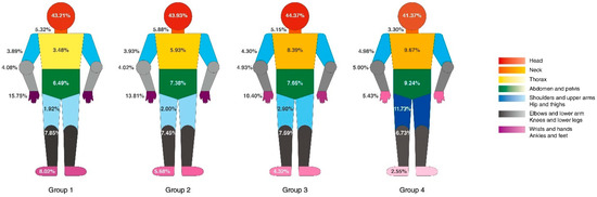 Anatomical sites of the injury according to age group analyzed by International Classification of Disease 10th Revision (ICD-10) codes. Group 1 (18–34 years old), Group 2 (35–49 years old), Group 3 (50–64 years old), Group 4 (≥65 years), presented respectively from left to right). Body parts are indicated by color. Higher color saturation indicates a higher injury rate.