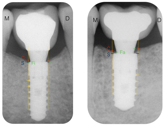 Figure 1 shows the reference landmarks for the X-ray analysis. In each radiograph, the most coronal part of the bone crest (C), the position of the implant shoulder (S), and the level of the first visible contact of the peri-implant bone with the implant (Fi) or abutment (Fa) were identified. The distance in millimeters from S to C was defined as the marginal bone level at the crest (MBLc), while the distance from S to Fi was defined as the marginal bone level at the implant (MBLi). The distance between S and Fa was registered as the marginal bone level at the abutment (MBLa). The MBLc distance was considered positive if the C mark was coronal to S, negative if C was apical to it, and as zero if C coincided with the implant shoulder. In the same manner, MBLi was considered negative if Fi was apical to S and as zero if Fi coincided with S or bone–abutment contact was detected. This radiographic analysis was completed by an independent researcher who did not know to which group each implant belonged.