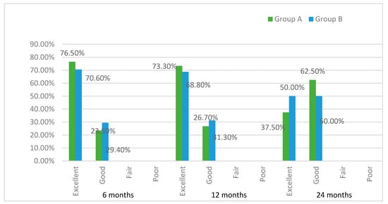 The overall satisfaction of the patients was high throughout the study and no statistically significant differences were found at 3, 6, and 12 months between groups, as shown in Figure 5.