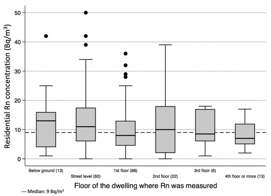 Seventy-seven percent of the sampled houses were three stories high, and 30% of bedrooms were at street level, 44% were in the second story, and 11% in the third; 6.4% were below ground level. Median radon concentration was similar regarding the height at which the detector was placed in the dwelling, as shown in Figure 4, although radon concentrations were slightly higher below ground.