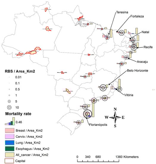 Despite the scarce knowledge on this subject, there are few resources allocated to investigating the role of exposure to electromagnetic fields from RBSs on human health. In the United States, for example, until 2010, no funding had been reserved by government agencies to study the possible health effects on people living near RBSs []. This study aims to estimate the rate of death for cancer according to RBS radiofrequency exposure, especially by breast, cervix, lung, and esophagus cancers, which are among the most common cancers in Brazil for men, women, or both sexes.