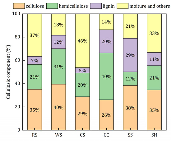 The raw materials were obtained from a peasant household in the countryside of Linyi, Shandong, China. The collected rice straw (RS), wheat straw (WS), corn stalk (CS), corncob (CC), soybean stalk (SS), and soybean hull (SH) were dried naturally and cut into similar pieces about 1 cm.