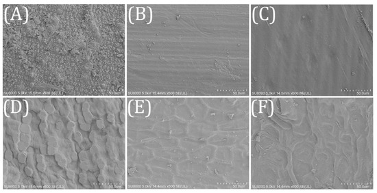 SEM for the investigated agricultural wastes (×500) (A) RS; (B) WS; (C) CS; (D) CC; (E) SS; (F) SH.