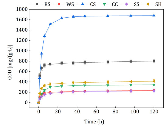 The carbon release curves of different agricultural wastes are shown in Figure 3. The cumulative COD released by CS, RS, SH, CC, WS, and SS were 1680.84, 801.31, 413.45, 344.83, 235.49, and 227.69 mg/(g·L). The raw materials had similar carbon release properties, but different amounts of the carbon sources were released. In the initial 6 h, the cumulative amount of the carbon sources increased quickly, and then the release velocities stabilized at very low levels in 6–120 h. Some potential explanations for this phenomenon are as follows: besides cellulose, hemicellulose and lignin, the natural lignocellulosic materials also contained large amounts of soluble and small molecular organic matter [27,28], which were released rapidly in the initial stage because of the concentration difference. When the inner small molecular substances were exhausted, insoluble cellulose and hemicellulose were hydrolyzed slowly to soluble organics by the microbes, which adhered to the raw materials with low biomass.