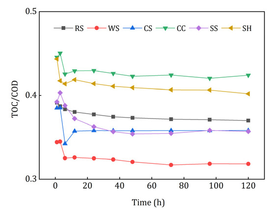 COD refers to the amount of oxidant consumed by reducing substances that are easily oxidized by strong oxidants [29], and TOC reflects the amount of the released organic carbon more accurately. As shown in Figure 4, there is an obvious liner relationship between TOC and COD. The TOC/COD of CC leachate was the highest, which demonstrated that the relative organic carbon released from CC was the largest. Conversely, WS had the lowest TOC/COD value, which may have caused inefficient denitrification and excessive COD in the effluent.
