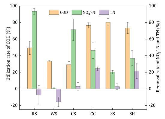 In order to investigate whether the organic carbon released from agricultural wastes in the initial stage could be utilized by the denitrifiers effectively, a one-day denitrification experiment using the leachate as carbon source was conducted, and the results are illustrated in Figure 5. The utilization rate of COD represented the biodegradability of the leachate, and the removal rate of NO3−-N and TN indicated the capacity of leachate as denitrification electron donors. The utilization rates of COD ranked in descending order were as follows: 80.41% ± 4.41% (SS), 76.50% ± 3.35% (CC), 73.57% ± 6.79% (SH), 49.40% ± 8.01% (RS), 33.45% ± 0.94% (WS), and 29.14% ± 3.86%(CS). The leachate of CC and SH obtained relatively higher TN removal rates, which means that their released carbon could be used by denitrifying bacteria more easily than that of the other wastes. Although RS and CS leachate had the highest nitrate removal rate, their TN removal was quite low and even negative. On the one hand, RS and CS released large amount of nitrogenous substances; on the other hand, the following denitrification process was incomplete, thus it caused the accumulation of NO2−-N. Therefore, the leachate of RS and CS was poorly available for the denitrifiers. Slight nitrate removal (0.94% ± 0.29%) was obtained by the leachate of WS, which indicated that it was not suitable as a carbon source. In conclusion, the leachate of CC and SH had better biodegradability and denitrification performance and lower risk of secondary pollution in the initial denitrification process.