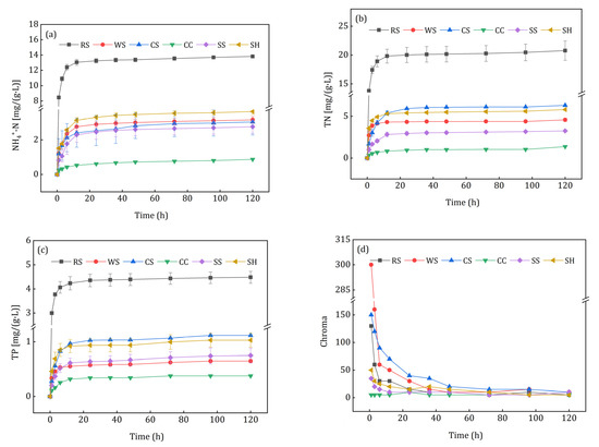 Release curves of secondary pollutants from the investigated agricultural wastes: (a) NH4+-N; (b) TN; (c) TP; (d) chroma.