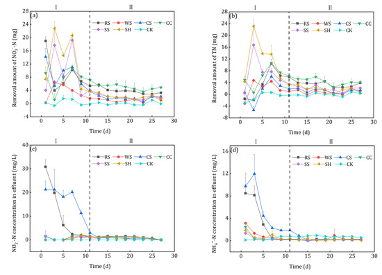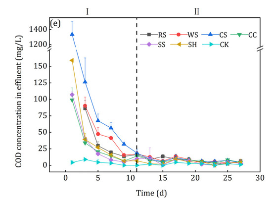 The shape of the TN removal curves was similar to that of the nitrate removal curves after agricultural waste addition (Figure 7b), but a slight difference was observed in the initial stage. The TN removal amounts of RS and CS, whose nitrate removal efficiency was quite high, were only −1.51 mg and 0.61 mg on the first day and then decreased in the following two days. Nitrite severely accumulated in the flasks to which RS and CS was added (Figure 7c), which indicated that incomplete denitrification occurred in phase I. Because of the NH4+-N release (Figure 6a), it accumulated in the effluents of all 6 kinds of agricultural wastes ((Figure 7d), especially for RS and CS. Rahman et al. [35] reported that dissimilatory nitrate reduction to ammonium (DNRA) tended to occur when the electron donor (COD) was much higher than its accepter (NO3−-N). Considering the high effluent COD of CS leachate (Figure 7e) and NH4+-N content in the raw agricultural wastes, the DNRA might be the reason of the highest NH4+-N in the effluent of CS leachate. In phase II, the effluent NO2−-N, NH4+-N and COD were quite low, i.e., 0.78–1.24, 0.12–0.44 and 4.31–9.80 mg/L, respectively.