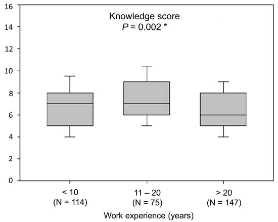 Knowledge score relative to work experience. * Kruskal–Wallis with post-hoc Conover test. Data are presented as median (interquartile range).