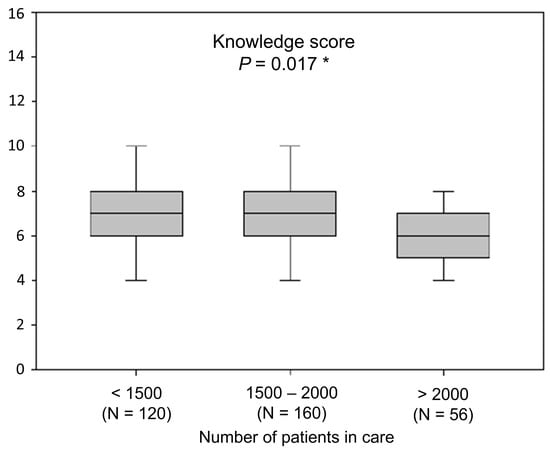 Knowledge score relative to the number of patients in care. * Kruskal–Wallis with post-hoc Conover test. Data are presented as median (interquartile range).