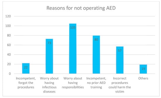 On the reasons for not operating an AED on the scene, the respondents could choose more than one answer. One hundred and five respondents chose ‘Worry about taking on responsibility’, 80 chose ‘Incompetent and without AED training’, while 73 selected ‘Worry about suffering from infectious diseases’. Please refer to Figure 1 for details.