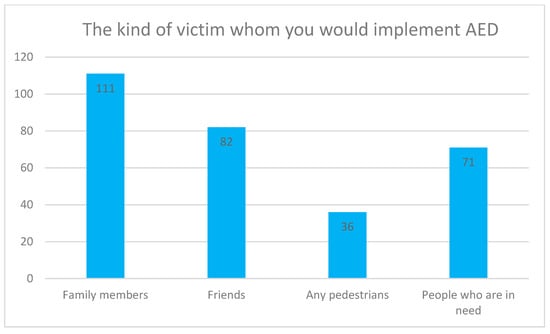 The kind of victim on whom you would implement AED. The respondents could choose more than one answer for this question.