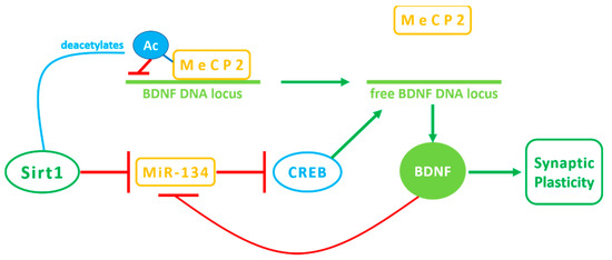 Other reports have indicated that manipulations of Sirt1 expression or activity enhances nerve growth factor-induced neuritogenesis, the outgrowth of axons and dendrites [69]. Regeneration of peripheral axons after injury is Sirt1-dependent and expression of Sirt1 in hippocampal neurons enhances dendritic arbor complexity, especially in CA1 neurons, whose dendritic spine density is reduced proportionally to Sirt1 depletion in some forms of neurodegeneration [63,70]. Moreover, Sirt1 protein activities contribute to synaptic plasticity and neuroprotection, slowing down brain aging [71,72]. The Sirt1-deficient hippocampus has decreased levels of key neurotrophins regulating synaptic functions, such as synaptophysin and neurotrophic factor (BDNF). This can be also explained by a reduction in cAMP response element-binding protein (CREB) binding to several neurotrophic promoters, as the levels of CREB protein in Sirt1-deficient brain decreased due to both an upregulation of miR-134, which Sirt1 normally suppresses, and a downregulation of methyl-CpG bindingprotein2 (MeCP2) deacetylation, which Sirt1 normally promotes [73] (Figure 3).