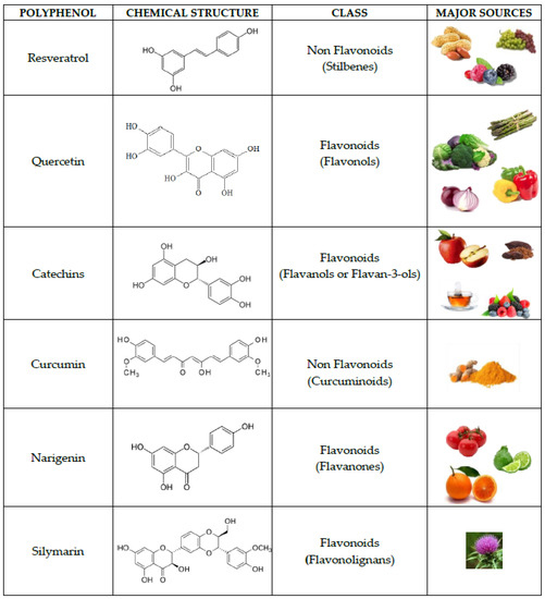 They are found in many plants and foods, such as vegetables, fruits, tea and wine, and long-term intake is correlated with health effects. Mediterranean diets are in fact linked to a decreased risk of chronic syndromes due to the intake of red wine and olive oil, which contain high quantities of polyphenols [46,115]. Polyphenols have various biological properties [116,117,118,119] and in particular, they are antioxidants [120,121,122]. A peculiar activity of polyphenols is their ability to cross the blood–brain barrier and to protect brain cells from damage and preserve their crucial function [114]. Polyphenols favor the activation of some anti-aging proteins, like Sirt1, which affects synaptic plasticity and memory. The mechanism inside this set of brain properties can be associated with the anti-inflammatory and antioxidant activities of polyphenols. Polyphenols defend lipids, carbohydrates, proteins, and DNA from oxidative injury, and they also induce augmented levels of antioxidant defense systems such as the superoxide dismutase, glutathione peroxidase, and ascorbic acid [123]. Figure 4 shows some polyphenols involved in Sirt1 activity.
