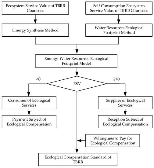 Based on the analysis of Section 3.1, the measurement of ESV of TBRB should include two parts: one is the estimation of total ecosystem service value (TESV) of TBRB, the other is the calculation of consumption of ecosystem service value (CESV) in basin countries. In the process of calculation, the rationality, scientificity, and comparability of ECS should be fully reflected. In this study, when formulating the ECS for TBRBs, it is reasonable to eliminate the CESV on the basis of TESV, and use the ESV as the ECS. In the selection of methods, the emergy method is used as the basic method to expand, combining the ecological footprint and the ecological carrying capacity of water resources. The emergy of ESV can be obtained by deducting the CESV, which can be converted by the emergy-currency ratio. It is scientific and comparable to reflect the ecosystem service value of the objective existence and consumption of TBRBs in the form of emergy.