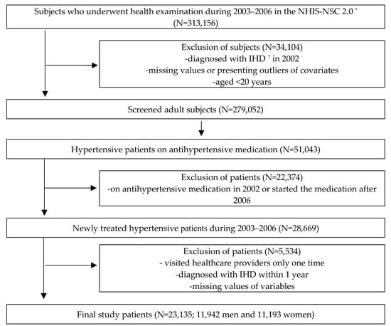 Hypertensive patients were defined based on ICD-10 codes (I10–I13 or I15) in the medical treatment database (DB) and received the first prescription of antihypertensive medication during 2003–2006. The incidence of IHD was identified based on ICD-10 codes (I20–I25) [] using the medical treatment DB; moreover, the date of patients’ first IHD diagnosis was recorded.