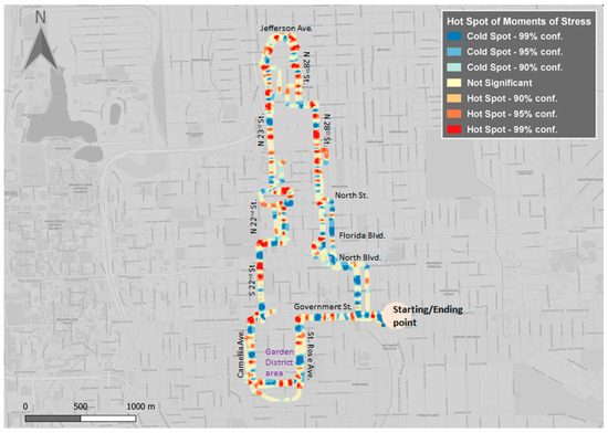 All 46 test participants were equipped with Empatica E4 wristbands to collect physiological measurements during the SVG. These measurements were then fed into a newly developed algorithm to detect test participants’ moments of stress (MOS) [32], followed by a custom spatial analysis [19]. The main purpose was to identify locations along the route that would show participants’ MOS and whether these locations could be associated with contextual information from the environment and/or topics discussed in the geonarrative. The following two interesting observations were made, when MOS locations from the subset of ten participants (five female and five male) were overlaid over the traveled route (Figure 12). First, the main intersections along the route show MOS hotspots. Several strong hotspots are located at Florida Blvd/North 22nd St., North Boulevard/North 22nd St., Government St./Camelia Ave. One explanation could be that the observed high densities are due to reduced movement speed. Another hypothetical explanation may have been that participants, sitting next to the driver in the front of the vehicle, did not always trust the driver’s ability to drive safely and that this “mistrust” was heightened at major intersections. This finding should certainly warrant more in-depth analysis and attention in future research. It is also important to note that this algorithm for detecting MOS was tested for walking and biking, and not for driving in cars [32]. Another remark includes strong MOS hotspots on North 28th street, particularly next to a very large lot under construction (i.e., new school), while in the same area there is very high positive polarity from sentiment analysis. The beginning of the route shows reduced stress and strong cold spots were identified on the first two streets of the route.