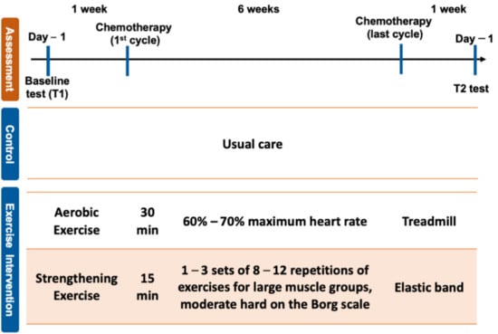 The exercise group received the intervention three days before the first cycle of chemotherapy. The chemotherapeutic drug, cisplatin, was given for four weeks, and the exercise program was carried out during chemotherapy and continued for four weeks after completion of the first cycle of chemotherapy. The dosage of cisplatin was 100 mg/m2, cisplatin was injected by IV on day 1 and repeated 6 weeks. Total duration of intervention was eight weeks, and each session was undertaken at the gym in National Cheng Kung University. The exercise program consisted of moderate-intensity aerobic, resistance and flexibility exercises supervised by a physical therapist and was provided three times a week. Each session lasted 90 min and included 5-min warm-up and a 5-min cool-down exercises. The training intensity of aerobic exercise on a treadmill was 60–70% maximum heart rate (HR). The resistance exercise using Thera-Band or free weight consisted of 1–3 sets of 8–12 repetitions of exercises for large muscle groups of the upper and lower body and the muscles in the core of the body. The intensity of resistance exercise was a rating of perceived exertion (RPE) of moderate hard on the Borg scale. The flexibility exercise consisted of static stretching of large muscle groups, including shoulder extensors and flexors, elbow extensors and flexors, hip extensor and flexors and knee extensors and flexors. The intensity, volume and frequency of the exercise program were increased when the participant was willing and able to progress. Participants in the control group received no specific information regarding exercise and were given general education including information about the side effects of chemotherapy. Figure 1 presents the protocol of this study and time points of outcome measurements.