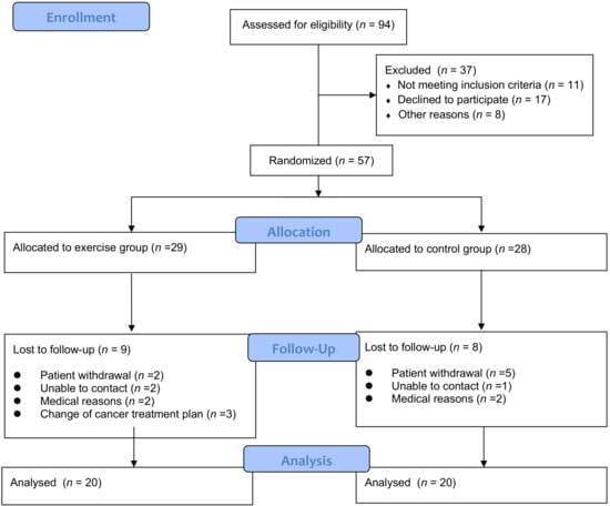 A total of 57 participants were recruited from September 2015 to May 2017, and 40 completed the follow-up assessment (Figure 2). The demographic and medical characteristics of the participants are shown in Table 1. The majority of participants had stage 1–2 (n = 23, 57.5%) disease. Half of the participants had a diagnosis of nasopharyngeal cancer (n = 20). There was no significant difference in participant demographic and medical characteristics between the control and exercise groups. This exercise program was supervised by physical therapists, and the compliance of the exercise group was 93.1%.