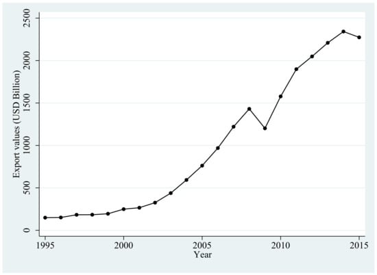 Moreover, Copeland and Taylor [] propose a “pollution haven hypothesis” which suggests that the decrease in trade barriers will cause pollution-intensive industries from countries with stricter regulations to move to countries with lax environmental regulations. Joining the World Trade Organization (WTO) is one of the important measures for a country to reduce trade barriers. In recent years, many studies conduct a series of analysis based on China’s accession to the WTO in December 2001 [,,,,,]. China’s exports witnessed a dramatic increase after China’s WTO accession due to the decline in trade barriers. Figure 1 show the surge in Chinese exports (Current price) between 1995 and 2015.