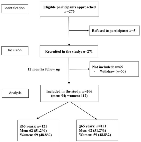 Recruiting flow chart. A total of 216 patients were recruited from an endocrinology outpatient clinic of a medical center. Eleven patients with missing data were excluded from this study. A total of 206 patients completed the baseline and 12-month follow-up measures. Among them, 121 younger patients (age ≤65 years) and 85 older patients (age >65 years) were analyzed separately in this study.