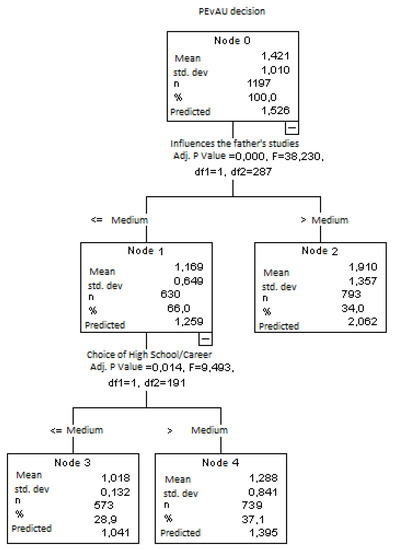 Figure 1 indicates that the variable “parental influence on university degree choice” is the best predictor of the decision to take the PEvAU. From here, it splits into Nodes 1 and 2. Node 1 shows that 60.6% of the students were influenced by their parents in their university degree choice compared to the results of Node 2, where 39.4% were not.