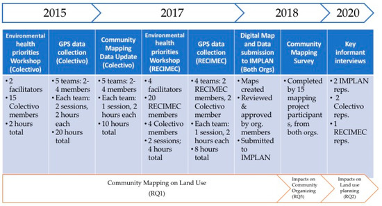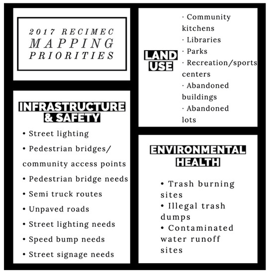 51]. IMPLAN representatives indicated that the community mapping results have informed the diagnosis process of the city-wide urban plan. The environmental health risk data served as ground truthing for the limited data that the agency had on the eastern region of the city. This data informed the critical issues that the city-wide urban plan must outline as priorities for urban development and zoning.