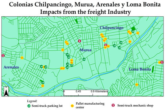 Figure 5). Pallet manufacturing centers and semi-truck mechanic shops are businesses that promote semi-truck traffic in the region; there are 28 pallet manufacturing centers and 5 semi-truck mechanic shops in the area. There are 19 semi-truck parking lots that also become a safety and health risk as this promotes more semi-truck traffic in the residential areas, near schools.