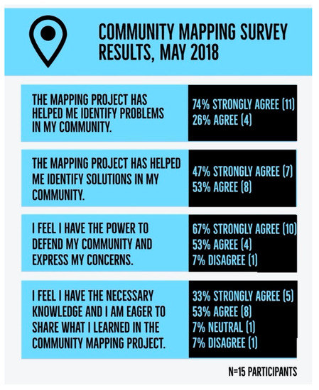 To analyze the impacts of the community mapping process on the organizing capacity of organization members, a short survey was conducted during the May 2018 workshop. The questionnaire prompted participants to agree or disagree with statements such as “I feel safe in my ability to talk with my neighbors about injustices in my community,” and “I think that this project will contribute to building better community.” The write-in sections of the survey included three prompts: (1) Why did you decide to participate in the mapping project? (2) What do you like most about your participation in the project? and (3) What do you think could have changed in the organization of the project? Fifteen participants filled out the survey out of twenty-three participants from both the Colectivo and RECIMEC (65% of participants). No identifying information was collected in the survey. While there isn’t a precise breakdown on how many members of each organization participated, workshop participation included about 70% Colectivo members and 30% RECIMEC members present. Fifteen participants, made up of both Colectivo and RECIMEC members, answered a short 10-question survey. This survey included a Likert scale questionnaire with 10 prompts and three write-in sections. This data was supplemented by a small focus group conducted with Colectivo and RECIMEC representatives in November 2020 on the question of mapping project impacts on community organizing.