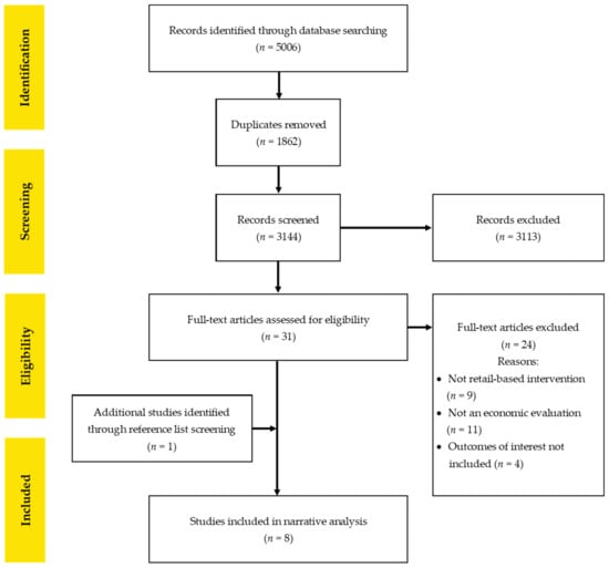 Tran, H.N.Q.; McMahon, E.; Moodie, M.; Ananthapavan, J. A Systematic Review of Economic Evaluations of Health-Promoting Food Retail-Based Interventions. Int. J. Environ. Res. Public Health 2021, 18, 1356. https://doi.org/10.3390/ijerph18031356