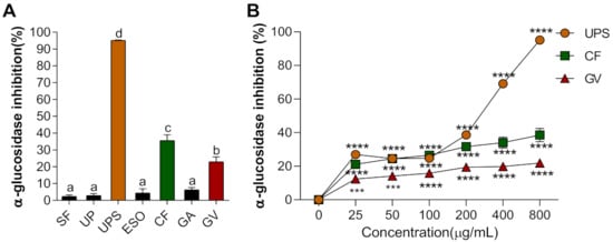 Alpha-glucosidase is a carbohydrate hydrolysis enzyme to control postprandial blood glucose levels, therefore its inhibitory property has been commonly used for screening natural products for their potential antidiabetic property []. We evaluated extracts of seven seaweed extracts that may be useful for diabetic treatment by delaying glucose absorption. The rate of inhibition of α-glucosidase activity was the highest in UPS (96.13%) extracts, followed by CF > GV > GA, ESO, and SF, as shown in Figure 1A. In addition, for the top three extracts (UPS, CF, and GV), the inhibition of α-glucosidase activity appeared to be dose-dependent (Figure 1B).