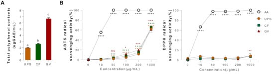 Total polyphenol contents and antioxidant properties of three seaweed water extracts. (A) Total polyphenol contents, values that do not share the same superscript are significantly different according to ANOVA (p < 0.05), (B) ABTS cation radical scavenging effect and DPPH cation radical scavenging effect of UPS, CF, and GV. Data are represented as the mean ± SEM of three independent experiments. * p < 0.05; ** p < 0.01, *** p < 0.001, **** p < 0.0001 compared with control group (0 μg/mL) using one-way ANOVA with Dunnett’s comparison test. Abbreviations: AA; ascorbic acid, UPS, Undaria pinnatifida sporophyll; CF, Codium fragile; GV, Gracilaria verrucosa.