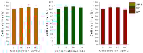 In order to determine the optimal concentrations of the selected three seaweed extracts to conduct further in vitro studies, the viability of C2C12 myotubes was evaluated at a dose range of 0–100 μg/mL using MTT assay (Figure 3). Within the tested concentrations of UPS, CF, and GV, 100 μg/mL of seaweed extract was used in subsequent experiments.