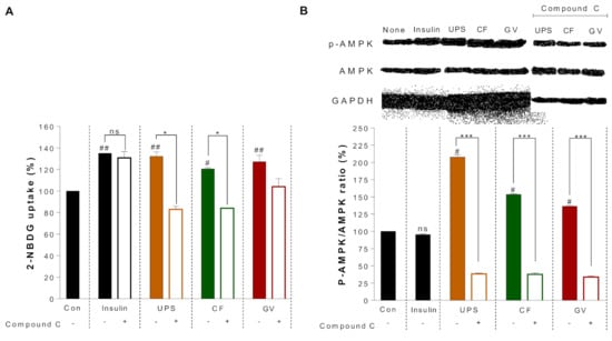Effects of three seaweed extracts on glucose (2-NBDG) uptake and phosphorylation of AMPK with or without compound C in C2C12 myotubes. Myotubes were treated with 20 μM of compound C and then exposed to 100 μg/mL of the three seaweed extracts. (A) Alteration of 2-NBDG uptake rate by seaweed extracts with or without compound C, # p < 0.05, ## p < 0.01; compared with control using one-way ANOVA with Dunnett’s comparison test, * p < 0.05; compared values with and without compound C using t-test, (B) alteration of AMPK phosphorylation by UPS, CF, and GV treatment with or without compound C in C2C12 myotubes. # p < 0.0001; compared with control using one-way ANOVA with Dunnett’s comparison test, * p < 0.05, *** p < 0.0001 compared values with and without compound C using t-test. Data are represented as the mean ± SEM. Abbreviations: UPS; Undaria pinnatifida sporophyll, CF; Codium fragile, GV; Gracilaria verrucose, Control; Con.