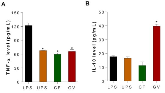 Effects of three seaweed extracts on TNF-α and IL-10 production in LPS-stimulated C2C12 myotubes. (A) TNF-α and (B) IL-10 production after UPS, CF, and GV treatment of C2C12 myotubes. C2C12 myotubes were pretreated with seaweed extract for 3 h, and LPS (100 ng/mL) was added for another 24 h. Data are represented as the mean ± SEM. Asterisks represent statistical significances compared with values of LPS treated group according to ANOVA (p < 0.05). Abbreviations: LPS, Lipopolysaccharide; UPS, Undaria pinnatifida sporophyll; CF, Codium fragile; GV, Gracilaria verrucosa.