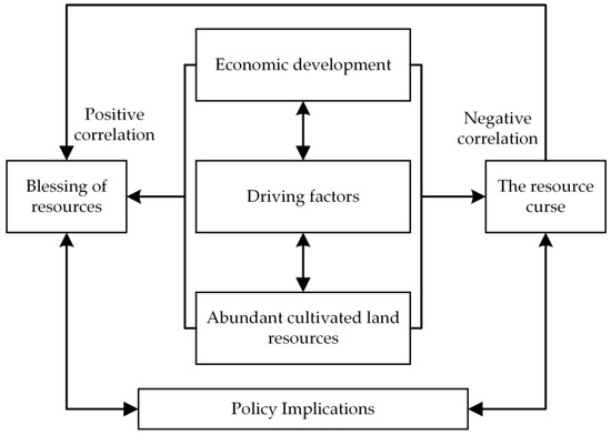 According to the current research results, we obtained the connotation between abundant cultivated land resources and economic development (as shown in Figure 2). Abundant cultivated land resources interacted with economic development through various driving factors. The positive correlation was “cultivated land resource blessing,” and the negative correlation was “cultivated land resource curse.” The policy enlightenment was given by analyzing the transmission mechanism between abundant cultivated land resources and economic development. The cultivated land resource blessing still existed, and the cultivated land resource curse completed the transformation from “curse” to “blessing.”