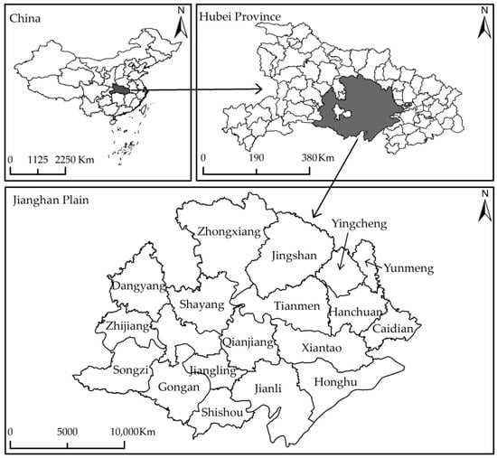 Jianghan Plain, which is located in the south-central Hubei Province, is an integral part of the Plain of the Yangtze River’s middle and lower reaches. It is situated in latitude 29°26′–31°36′ N and longitude 110°14′–114°13′ E, covering an area of approximately 38,000 square kilometers (as shown in Figure 3). Jianghan Plain covers eleven cities, six counties, and one district (all county-level administrative regions). Jianghan Plain has excellent hydrothermal conditions, flat terrain, fertile soil, and rich cultivated land resources. As an essential grain, cotton, and oil production base in China, Jianghan Plain has always undertaken the vital mission of ensuring agriculture and food security. Given its unique geographical advantages, Jianghan Plain was once one of China’s most economically developed areas [49] and was reputed as “Home of Fish and Rice.” However, in recent decades, the economic development of the Jianghan Plain has obviously lagged, with the proportion of its GDP in Hubei Province gradually decreasing from 25.76% in 1990 to 16.72% in 2018. The proportion of its GDP in the whole country gradually decreased from 1.18% in 1990 to 0.71% in 2018 (Hubei Provincial Bureau of Statistics).